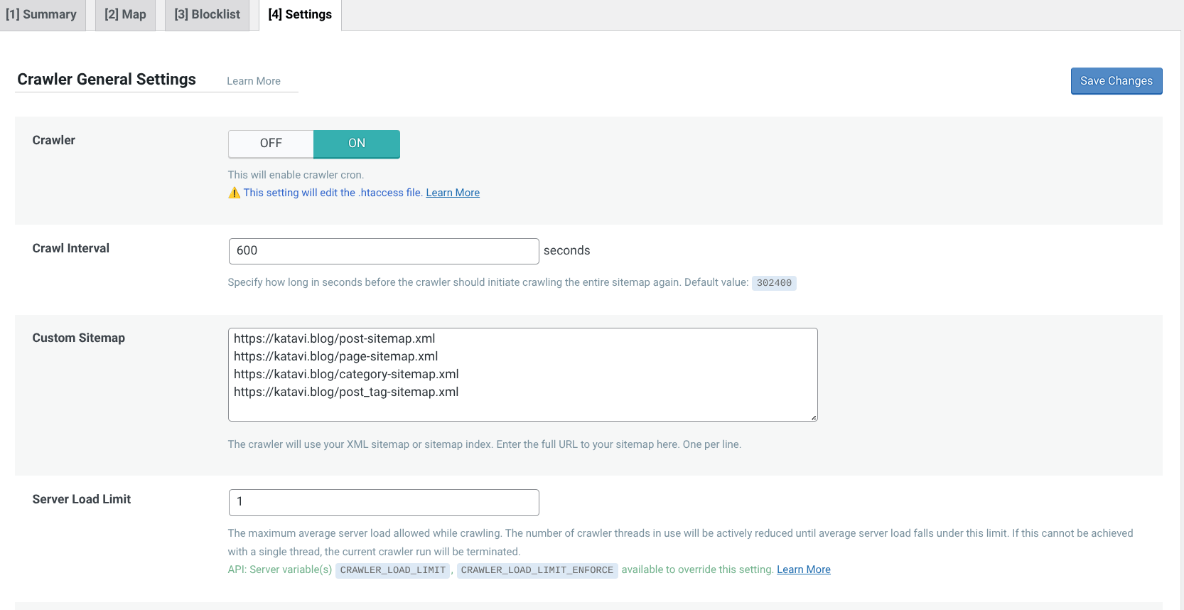Selanjutnya buka tab “Settings” dan klik ON untuk mengaktifkan crawler: